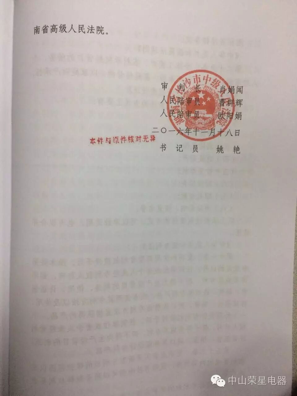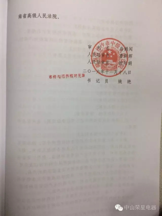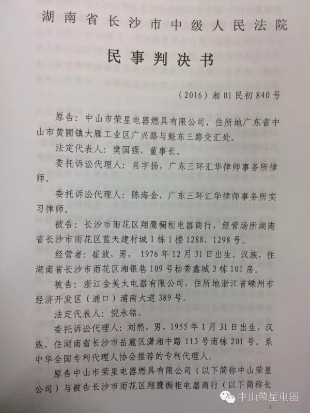 2016年11月18日,中山市榮星電器燃具有限公司又獲得一個好消息!湖南省長沙市中級人民法院對侵權者判決瞭!對被告長(zhǎng)沙市雨花區翔鷹櫥(chú)櫃電器商行、浙江金美太電器有限公司判決如下: