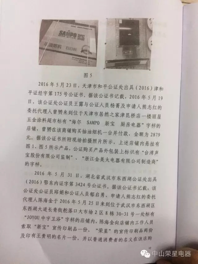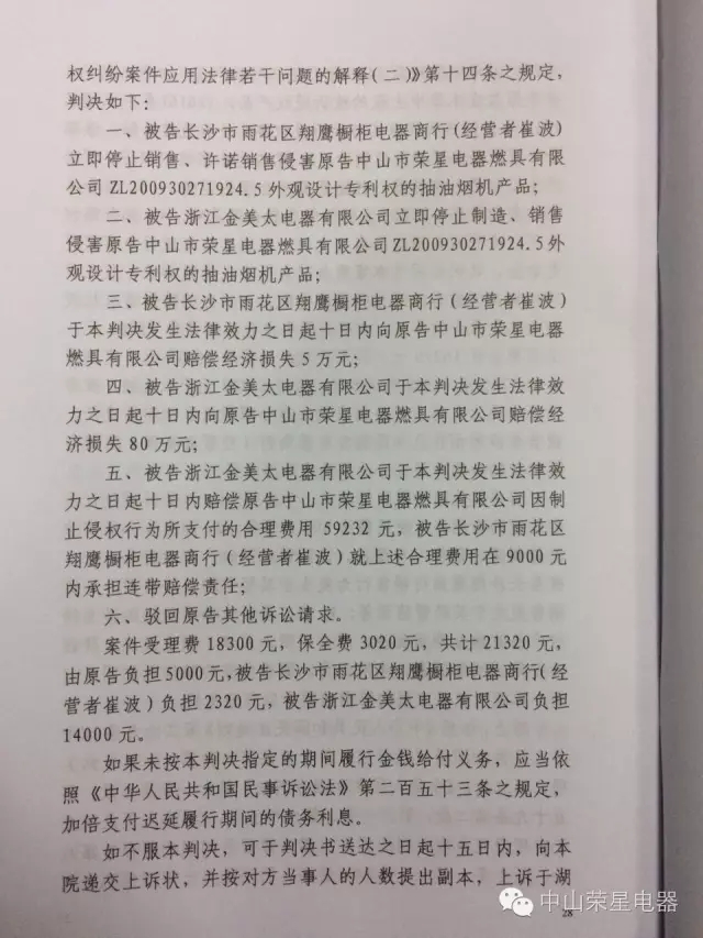 五、被告浙江金美太電器有限公司與本判決發生法律效力之日起十日内賠償(cháng)原告中山市榮星電器燃具有限公司因制止侵權行爲所支付的合理費用59232元,被告長(zhǎng)沙市雨花區翔鷹櫥櫃電器商行(經營者崔波)就上述合理費用在9000元内承擔連帶賠償(cháng)責任;