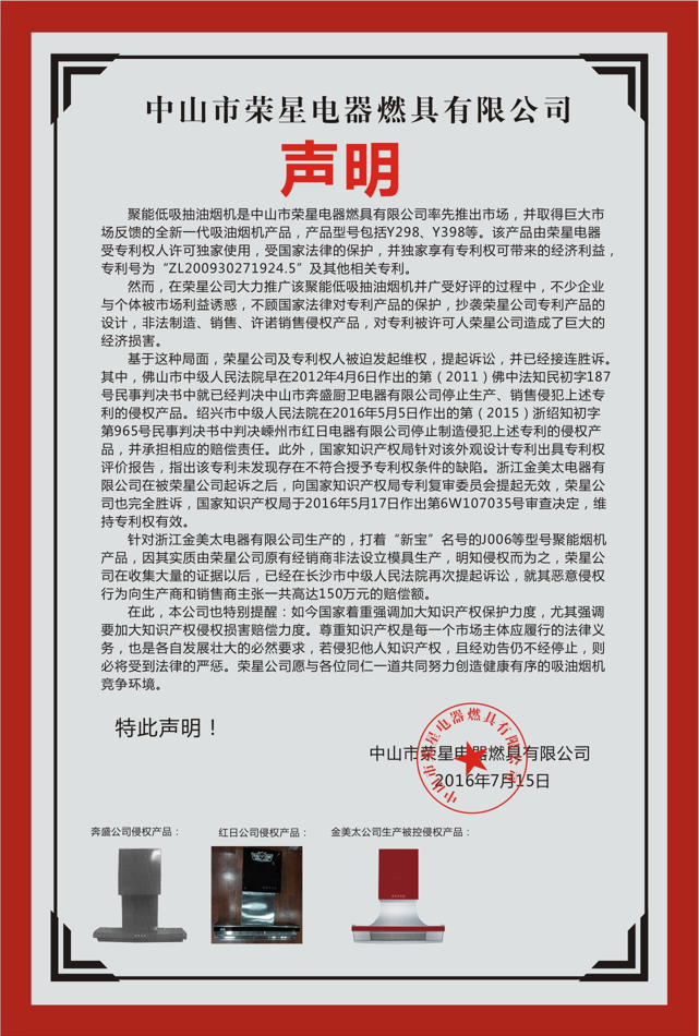 中山市榮星電(diàn)器燃具有限公司專利維權(quán)聲明