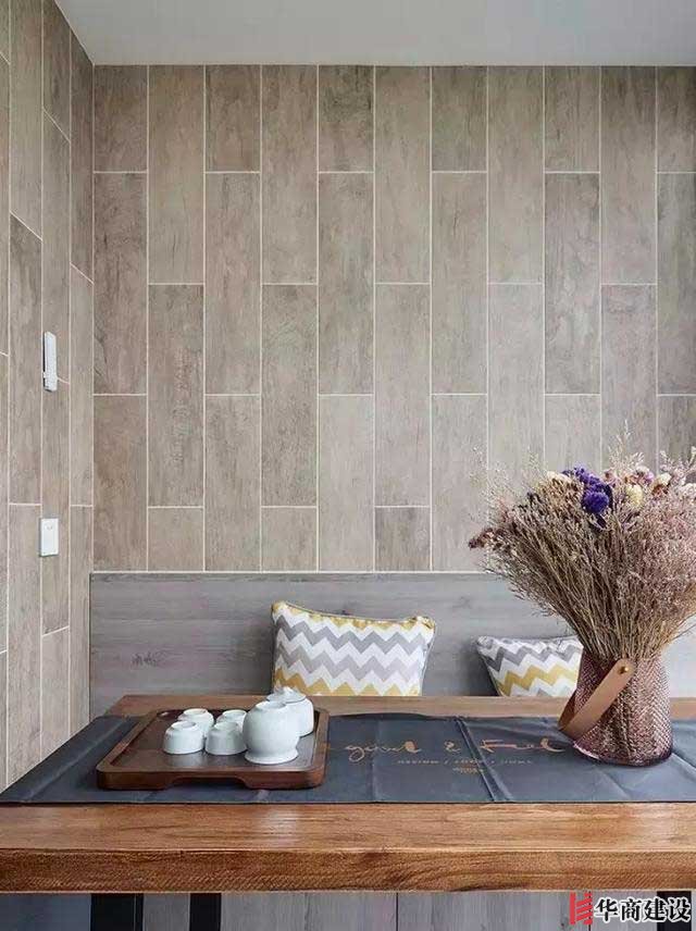 第二種:仿木紋磚+休閑卡座。傳統觀念裏頭卡座隻有餐廳可以設計,其實陽台也是可以的,陽台空間狹小,牆面使用溫潤的木紋瓷磚,小卡座搭配原木休閑桌,一處小茶室空間就有瞭。
