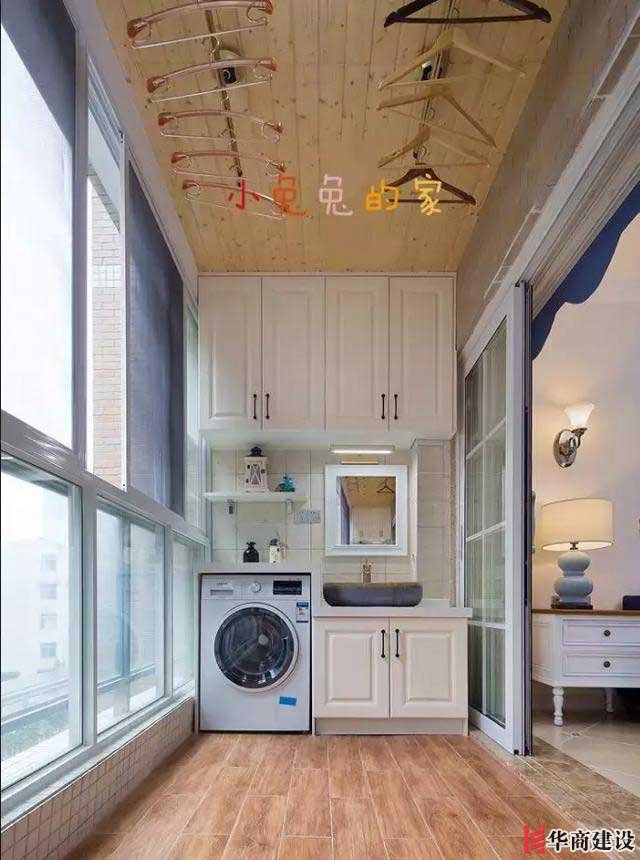 第八種:常規生活陽台做法。鑲嵌洗衣機,洗手台,吊櫃儲物。這是大部分家庭陽台的做法,滿足日常生活需求。最簡單也是最複雜的做法,施工規劃要有一定的經驗。