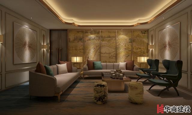 這個是董事長會客室,這個部分的設計跟辦公室的設計採用的就是兩種不同的設計風格,會客室的設計更加的莊重、正式,牆壁上挂著清明上河圖的壁畫,這不僅體現瞭老闆的文學素養,而且也使整個空間熠熠生輝!